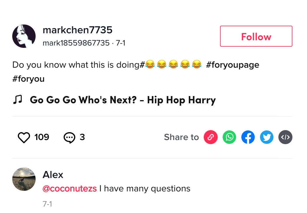 I’m going to guess it’s a Chinese eStore though. It’s still sort of novel in the US, but in China, TikTok-like short-form video apps have already essentially replaced physical stores. Both TikTok accounts associated with the Sarahwang0725 email started earlier this year and from what I can tell, the incredibly surreal videos are just a way to advertise the shoes. Here's a really good interaction I found in the comments of a video where a person wraps their toes in tinfoil and a big banana leaf and then puts on a running shoe: