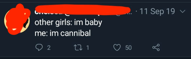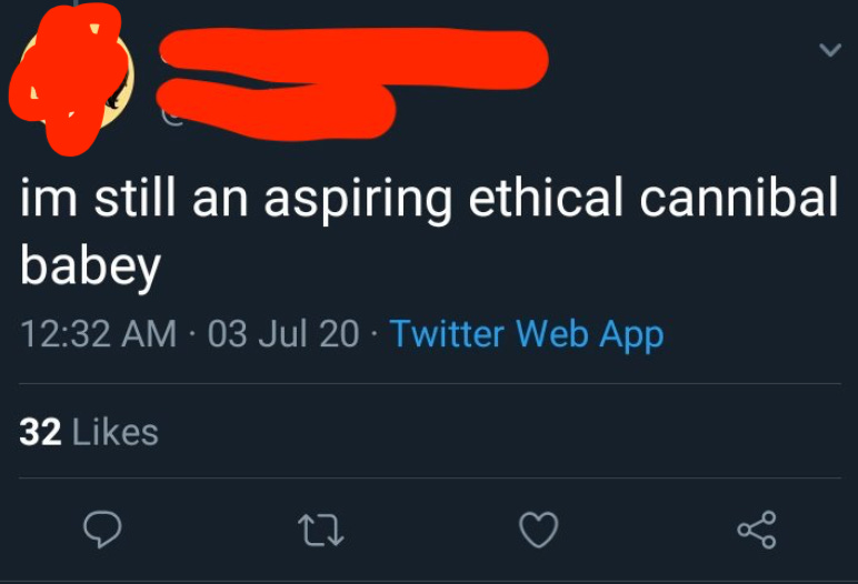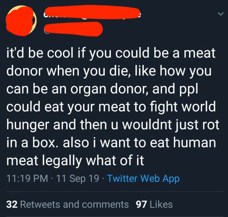 Due to Twitter’s design features and its completely unstable user base, the joke is indistinguishable from something serious written by one of the real nut jobs on there. For instance, in this case, ethical (and unethical) cannibals are real and they are definitely on Twitter.