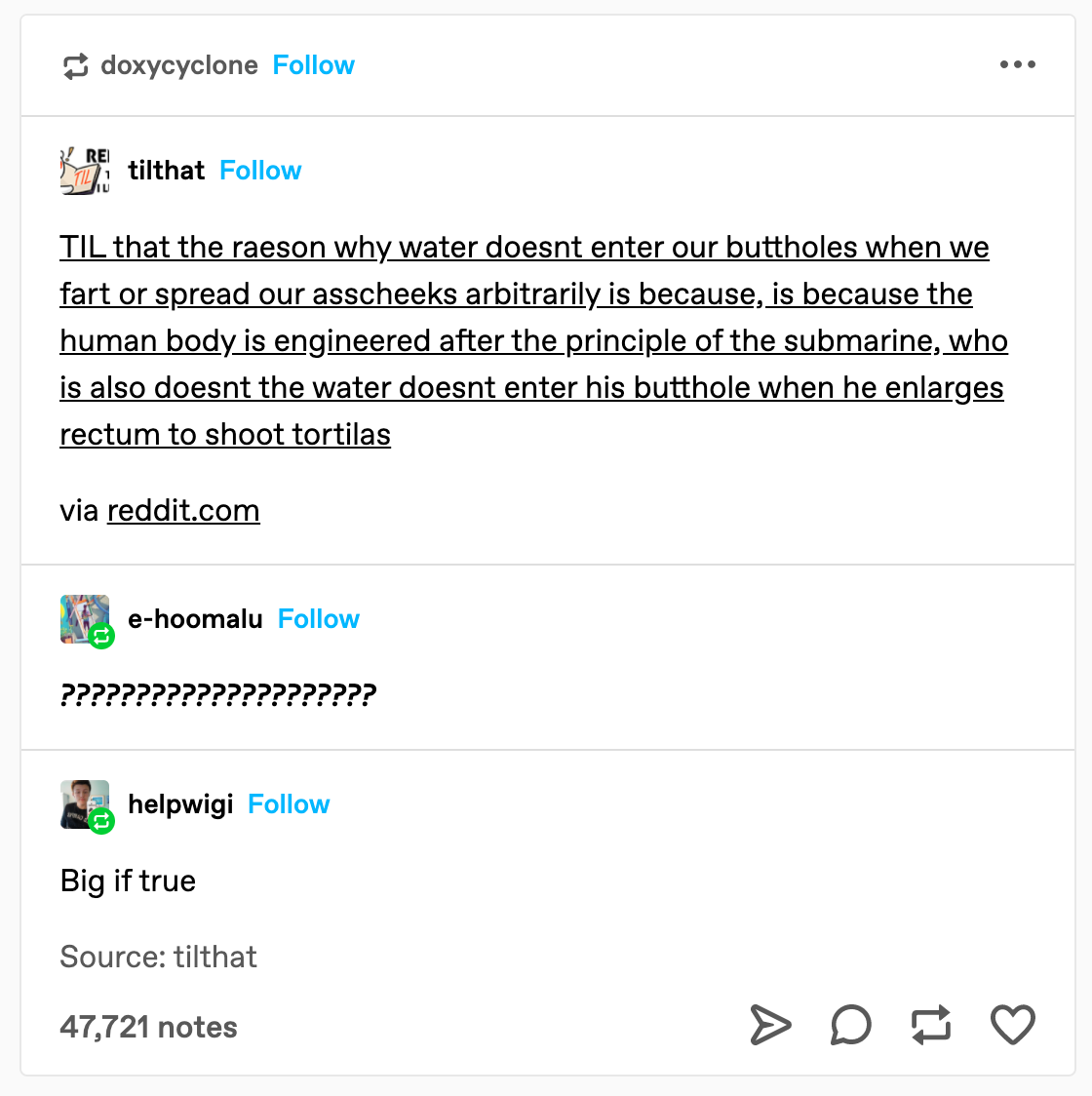 The post above comes from a blog that automatically shares posts from r/todayilearned. I clicked through to the original hoping to get some more info about what the OP was trying to say. Here’s the top comment: