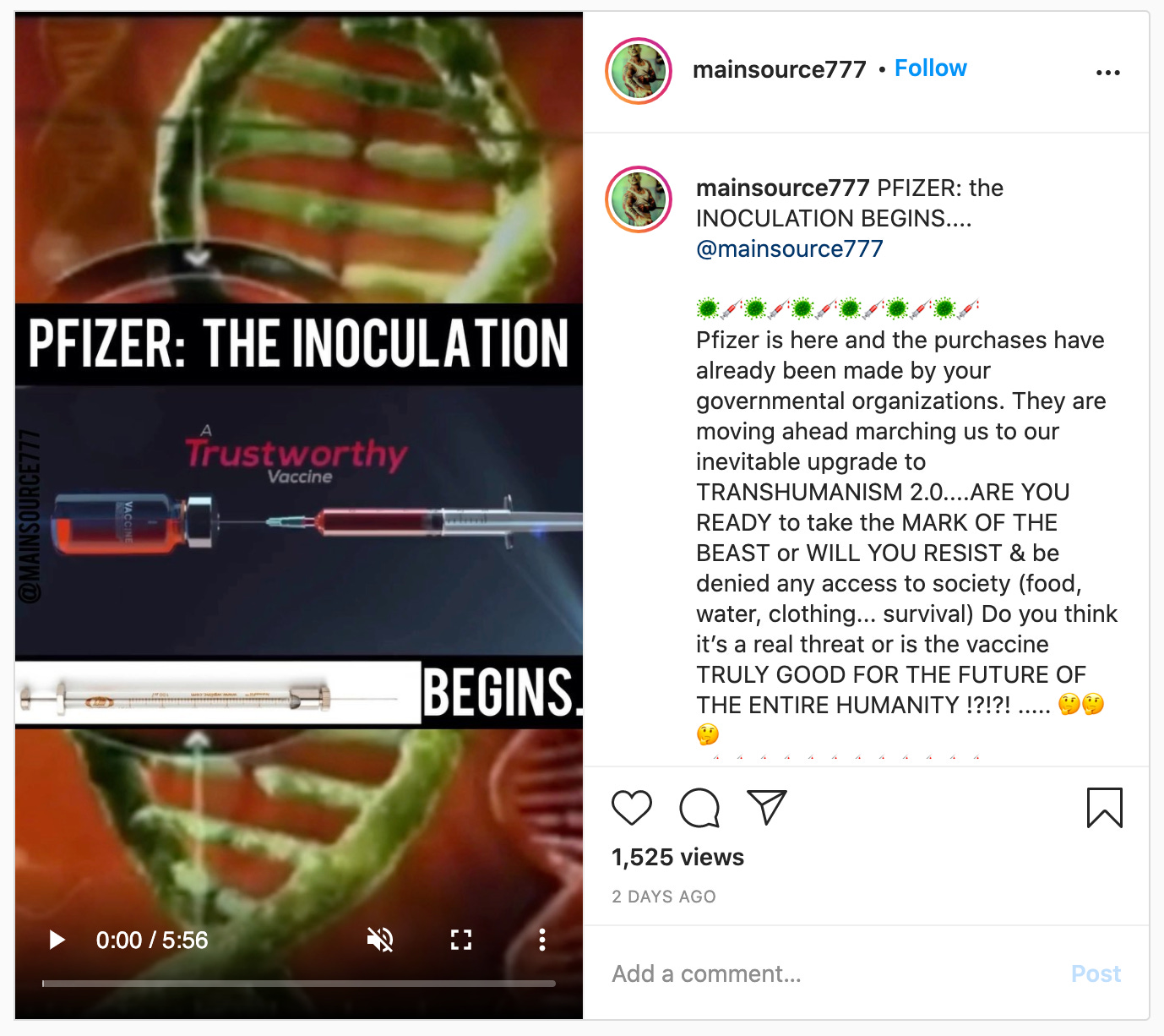 The video was created by a group called The Mirror Project, who recently got booted off PayPal for spreading misinformation about COVID-19. They also have an uncomfortably slick website. The Mirror Project’s YouTube channel seems to have evaded any kind of moderation. Their videos, which are tagged #COVID, don’t even have a CDC widget beneath them. They’re also super active on Instagram.
