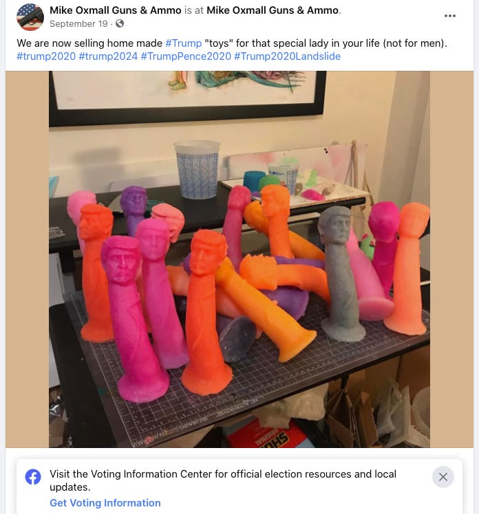 Weirdly, though, I can’t find any evidence that this store actually exists. The page was created back in August and its earliest post is using a picture from a Pittsburgh gun store. What I find really interesting is I cannot tell if this is a genuine pro-Trump page, a very dedicated work of satire, or part of some weird foreign PsyOp. I’m leaning towards satire, but the page is constantly talking to people in the comments and lot of the posts look like a troll, but some are also just normal MAGA spam. Which I feel like really says something about the current state of Facebook! Anyways, if someone wants to try and buy one of these dildos, let me know how it goes.