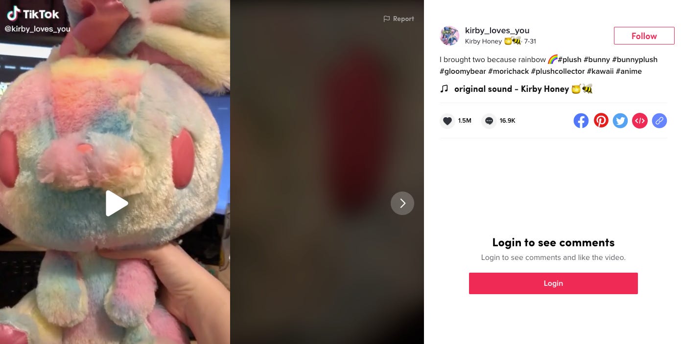 This story is a straight up mess. And weirdly connects to the upcoming sex-negative reactionary movement I described in Wednesday’s issue. It was sent to me by Brian Hastie, who said, “retroactively applied sex-inclusive labels to Japanese plush toys that are mostly collected by adults sounds like your type of content,” which is something I’ll have to pull apart in therapy at some point.