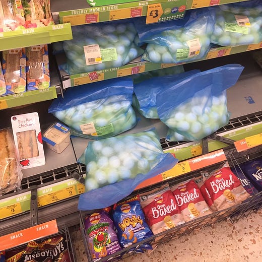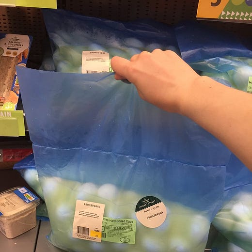 I showed this tweet to British person and co-host of my podcast, Luke Bailey, and he actually had a theory about what has happened here. In the UK, it’s very common to buy individually-wrapped hard boiled eggs in the snack section of a supermarket. (British people like eggs.) He thinks that these bags were meant to be divvied up into small containers and sold and someone probably just said, screw it, and put them out as is. You can listen to his whole investigation on this week’s episode.