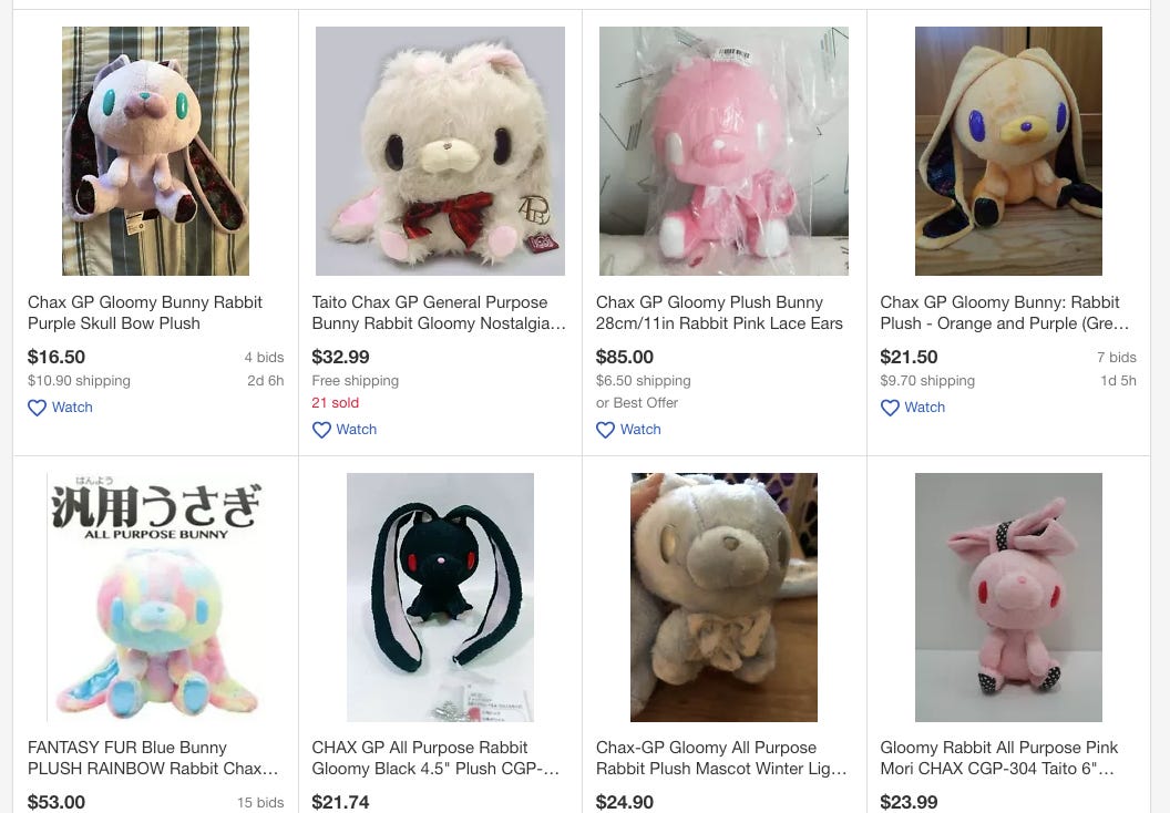 The r/HobbyDrama post about this is really dense, so I’ll do my best to break it down for you. There’s a famous Japanese plush designer named Mori Chack who makes rare, sought-after kawaii plush dolls, called “Gloomy bears”. Collectors sell these plush dolls on eBay and the “all purpose bunny” is particularly popular one. Here’s what these little guys look like: