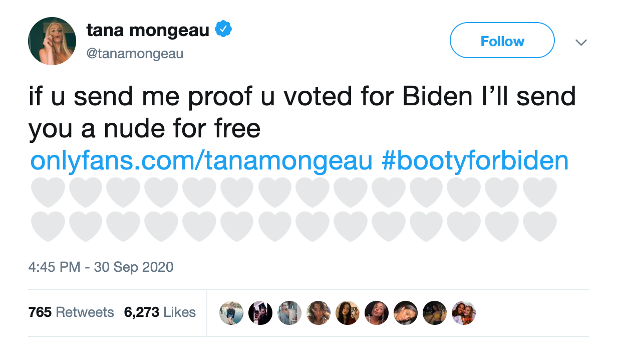 One of my favorite endearing kinds of internet stories is when influencers do something that breaks the artificial reality of their world and then come crashing into ours. For instance, this week, YouTuber and Jake Paul’s ex-fiancée Tana Mongeau started a campaign called #BootyForBiden. In a now-deleted tweet, Mongeau said that if you sent her proof you voted for Biden, she’d send you a nude for free.