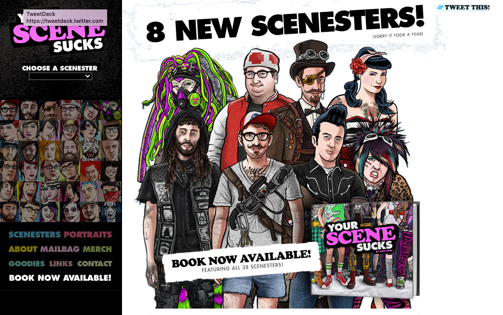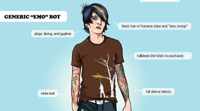 It's weird because I don't know if people use [Your Scene Sucks] as a guide or a starting point for how to dress like these things or if they are in on the joke. I once ran into some kids in a mall food court and they had on a Fall Out Boy shirt I designed. I stopped them and was like, "oh that's cool, I've never seen this shirt in the wild." And we got talking about something and I mentioned that I made the site and he goes, "Oh yeah, that's why I've got this pin right here on my pants." And I just went, "Oh my god," and I just had walk away because I realized this thing that I created might actually dictate how people dress and act in a certain way and I didn't know if that was a good thing or a bad thing.