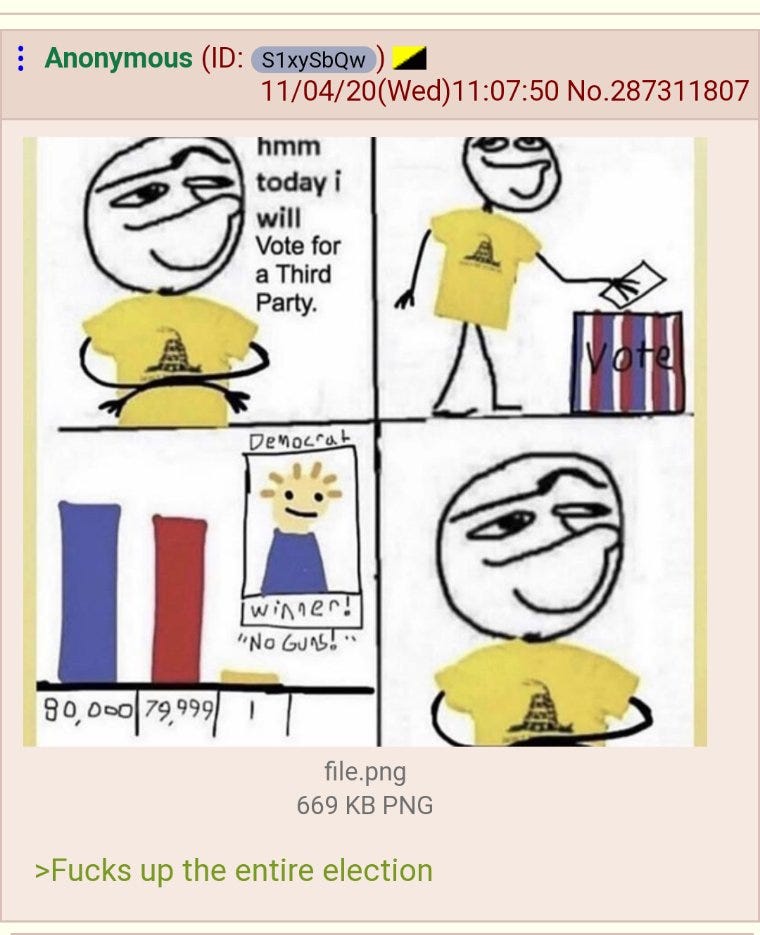 And finally, I want to caution anyone enthusiastically sharing “4chan is having a meltdown right now” tweets. Users on the site had nervous breakdown in 2016 when it briefly seemed like Clinton might win. Defeat and self-hatred is a 4chan user’s natural state. That said. This post is pretty funny.