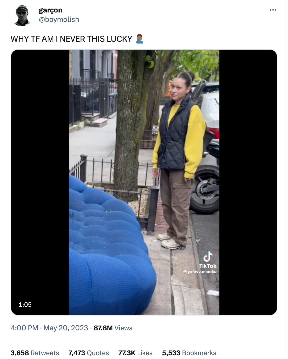 This big blue couch is simultaneously stuck inside of TikTok’s and Twitter’s respective algorithms at the moment. The initial video was watched 45 million times on TikTok and another 87 million on Twitter. The TL;DR is that a TikTok user named @yafavv.mandaa found the couch on the side of the street “in the pouring rain” and believed that it was a Roche Bobois Bubble Seat.