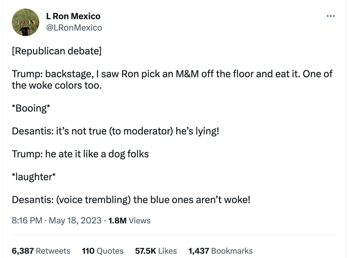 You can see this acutely with the pre-presidential campaign of Meatball Ron “Pudding Fingers” DeSantis, who looms larger-than-life over conservative media via his outlandish legislation, headline-grabbing press releases pegged to the right-wing grievance cycle, and mean tweets intimidating political journalists. But in meatspace, the guy has the charisma of a high school DARE officer who may or may not have wiped his snot on an old man’s shoulder at a recent event in Iowa. And it’s an especially bad liability when you’re running against Trump, who, unlike everyone else trying to take over the country by copying him, mostly through instinct, has mastered how to basically be the same kind of maniac online and off. In other words…