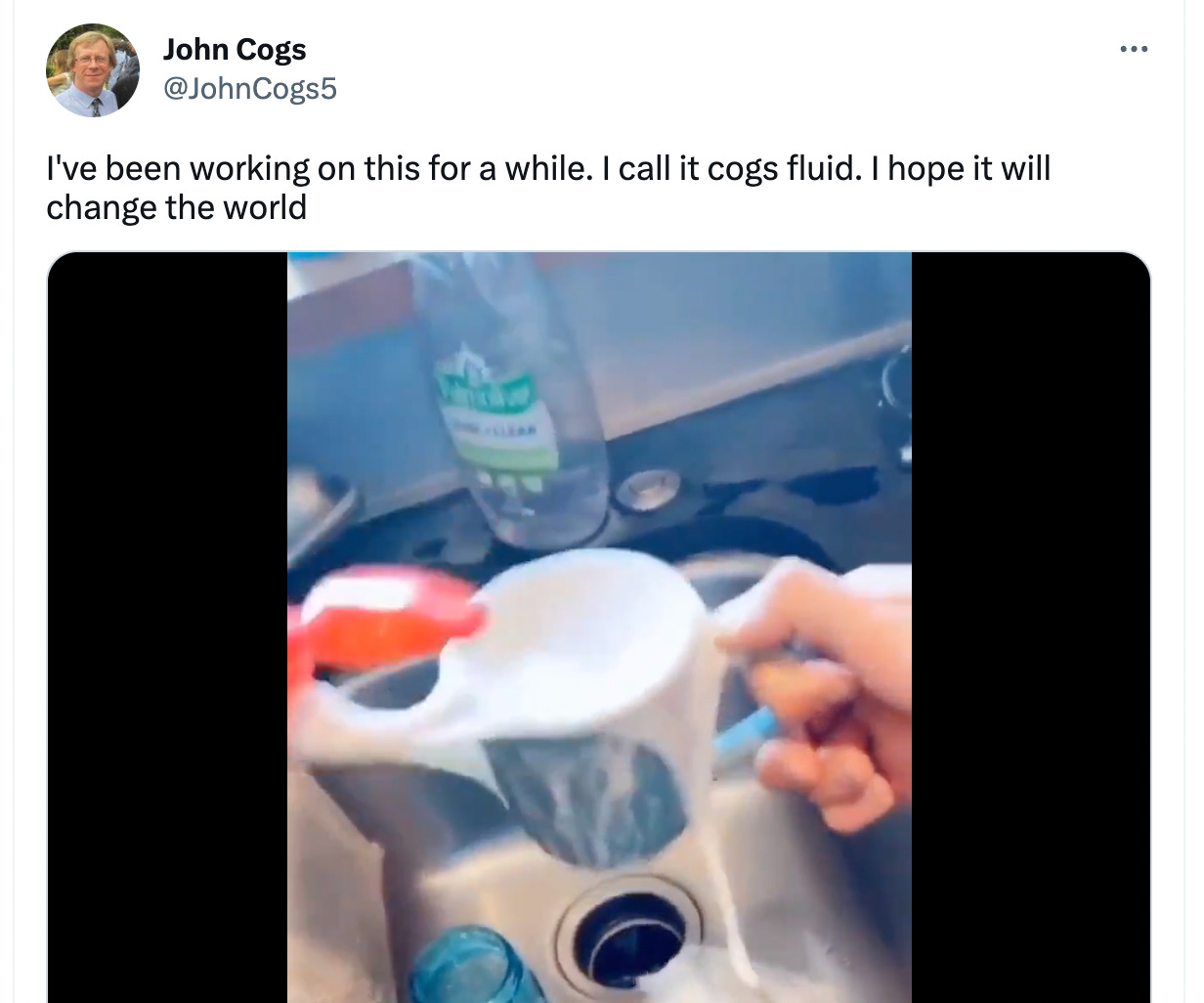 John Cogs is a scientist (I think?). And, in 2020, he posted a video of an invention he says he created called, of course, Cogs Fluid. You can watch the video here. I tried to find out more information about Cogs and his fluid (sorry), but I can’t find anything. It seems like it’s some kind of white, semi-viscus industrial liquid made out of what he claims is a “silicon-based polymer”. He says that he signed an NDA, though, and can’t talk more about it publicly.