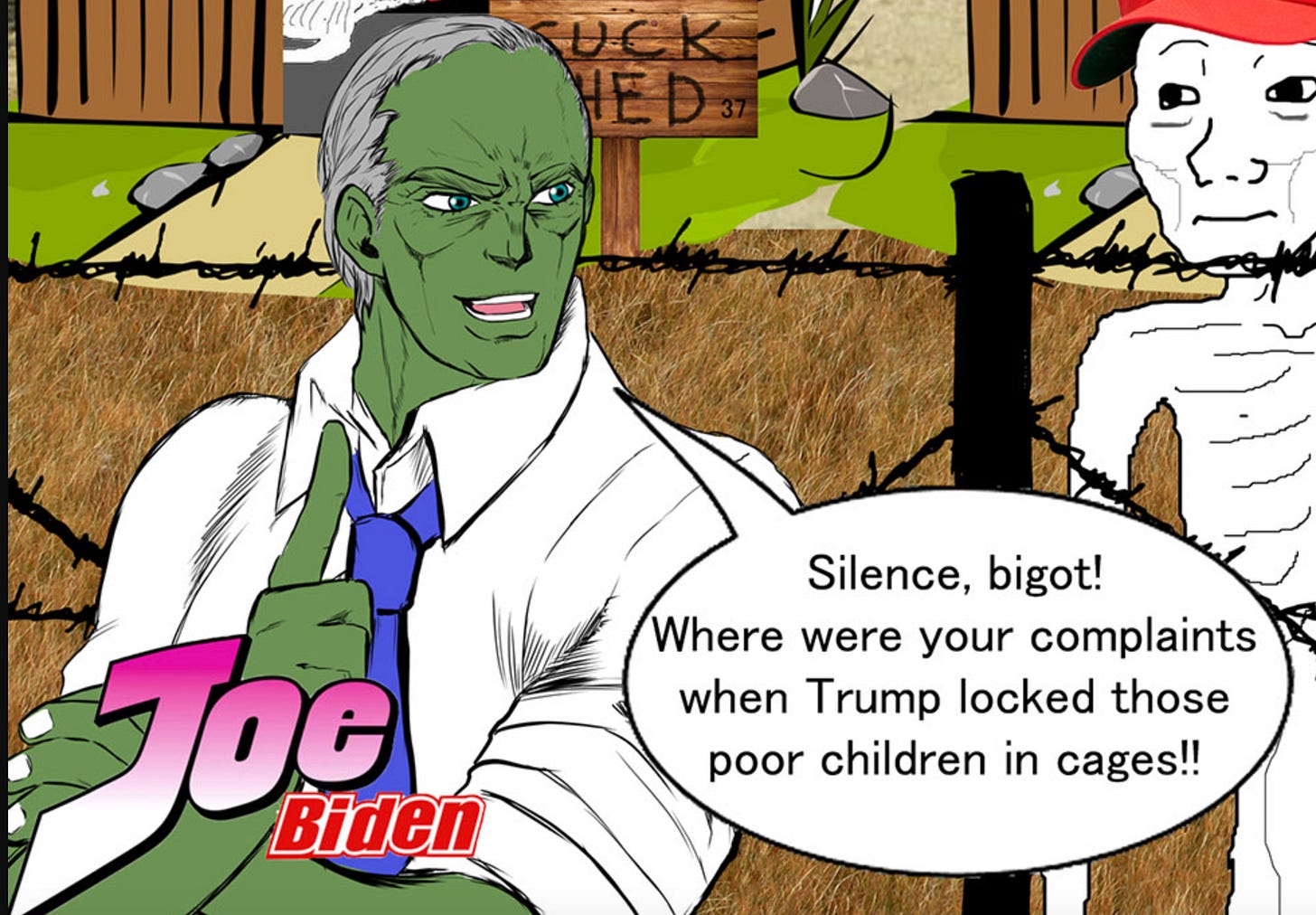 Well, Tyler is in luck because I get this reference. To understand this Biden Pepe, you need to be familiar with an anime called Jojo’s Bizarre Adventure. It has a very specific art style. I had a friend explain the plot of it once and it took him several hours and nothing he said made any sense, but he was very excited about all of it.