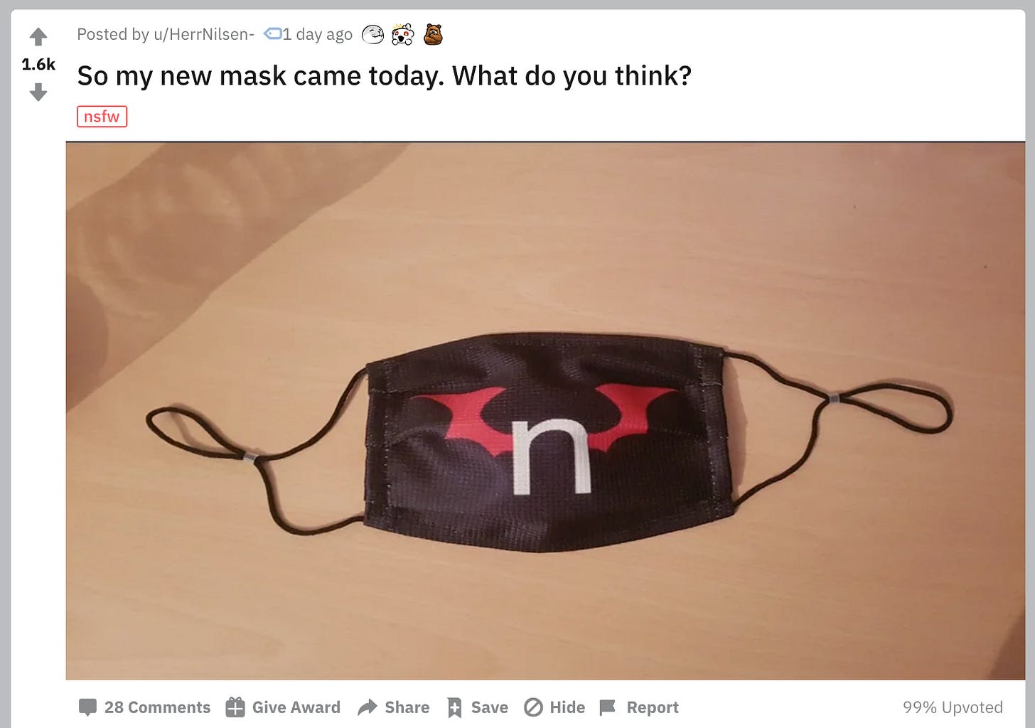 It’s the logo for nHentai, which is like a Pornhub-style website for anime porn. Now you know. Apparently this guy is gonna wear the logo on his face. Here’s a really good exchange from the comments of this post: