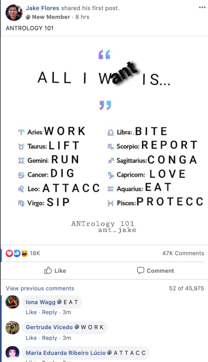 OK, quick catch up here. There’s a Facebook Group called “A group where we all pretend to be ants in an ant colony,” where 1.7 million people are roleplaying being ants. I refuse to join the group, one, because it’s private and seems like a hassle, and two, I’m in too many terrible Facebook Groups already. Last week, I asked for spies to send me stuff from inside the group. Garbage Day reader Kádár sent me some screenshots.