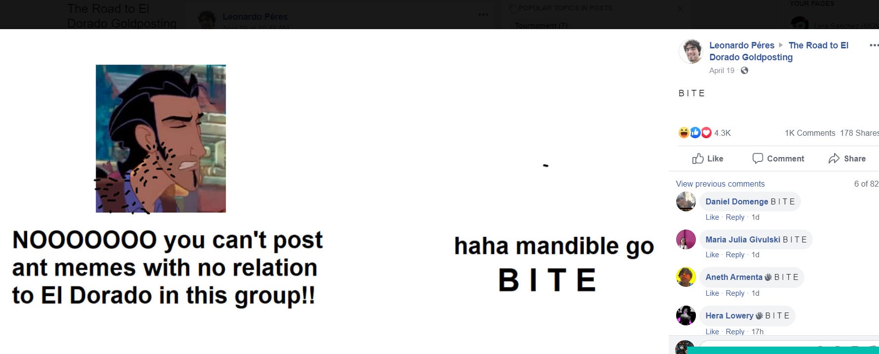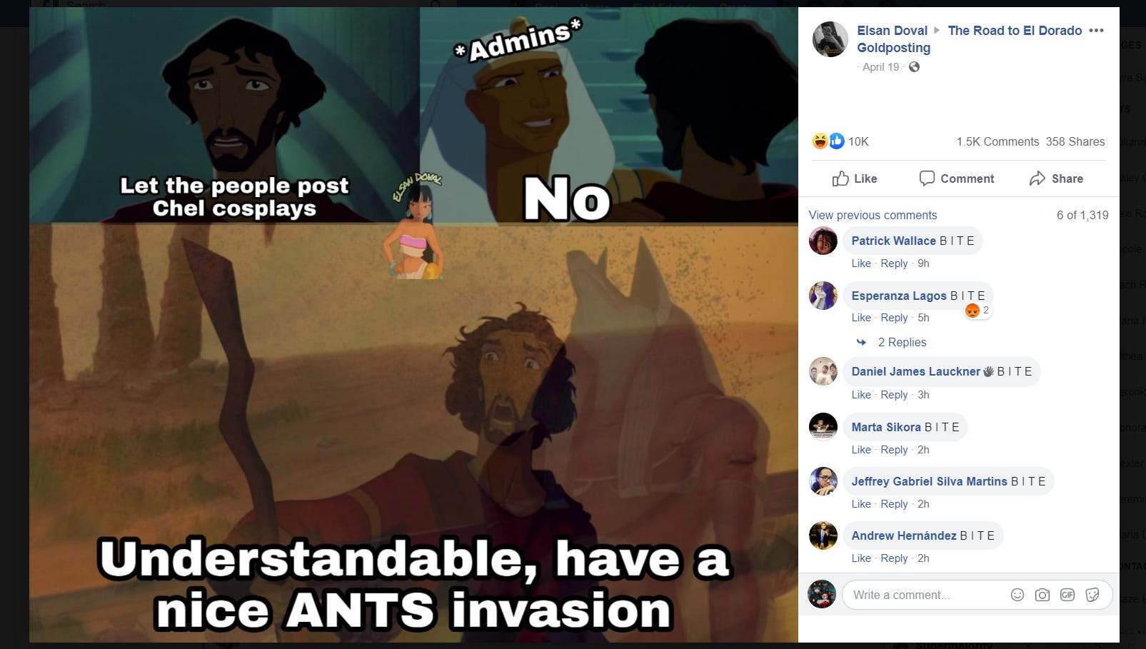 So not only has the ant group completely spun out of control, it looks like they’re also invading with other groups — specifically the “The Road To El Dorado Goldposting” Group. Based on the screenshots I’ve seen going around Tumblr, it seems like the drama might have kicked off after some users wanted the ability to share sexy pics of cosplayers dressed like the character Chel? Honestly, not sure.