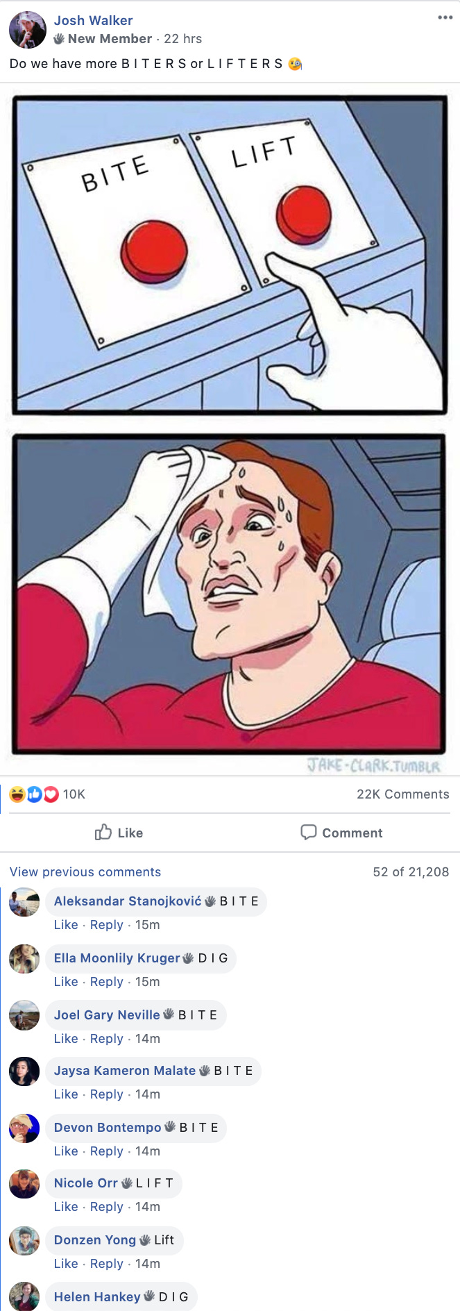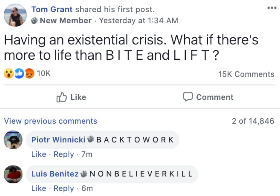 The number of commenters/comments are batshit insane. i saw posts less than an hour old with almost 12k comments. here's one from 8 hours ago that has 45k comments. it's wreaking havoc on my facebook timeline because if there is an "active" post people keep commenting and my timeline just scrolls by itself bc facebook is updating it in real time. browsing the group presents the same issue.