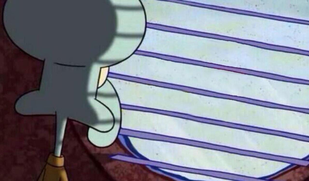 I forgot about the quarantine and, for a moment, thought the joke was that Spongebob and Patrick had passed away and Squidward was simultaneously silently mourning them while internally wishing he had treated them better while they were alive.