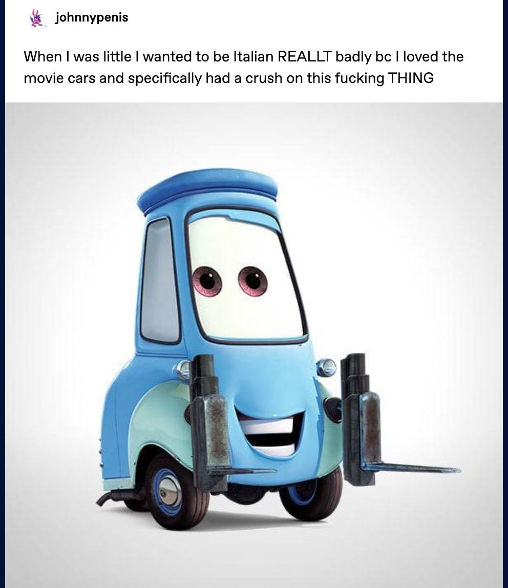 all it’s line are in Italian and it’s name is GUIDO. And everyone knew I was obsessed with Italy in elementary school but they didn’t know why bc I, even as a young autistic child, had the sense to know this was a rightfully so, highly mockable thing. So I would read about cars on IMDB and then one day someone posted a crackfic on the message boards there and it was about this guy getting drunk and beating his wife, and it snapped me out of my fugue long enough to realize how absurd wanting to be Italian was, but then it made me cry really hard and my parents were like ‘hey what the fuck’ and I didn’t have the chutzpah to admit anything so I told them I saw a naked lady online and then they went into the computer and found all the weird south park midi songs I downloaded on lime wire and I thought they were literally going to kill me for about two weeks.