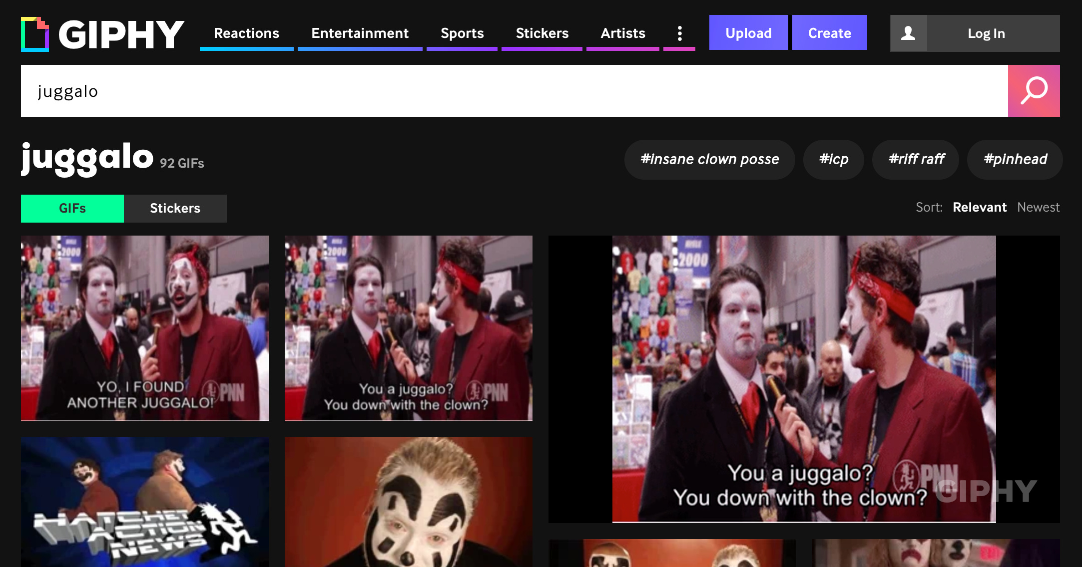 Fun fact: I’ll be there, trapped inside GIFs currently walled off behind Giphy, now part of Facebook. Right now, if you search “juggalo” on Giphy, I’m all over the first page of results: