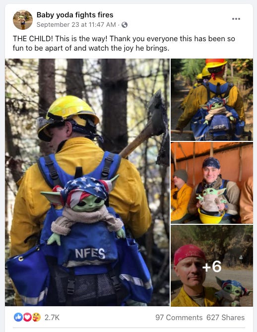 And Baby Yoda has spent the month with different crews putting out fires. You can follow his journey on Facebook. I may have slightly teared up going through the page, completely overwhelmed by how kind and nice and silly people can still be even in the face of horrific world-ending madness. I also appreciate that the Facebook page accurately refers to Baby Yoda as his canonical name, “The Child”.