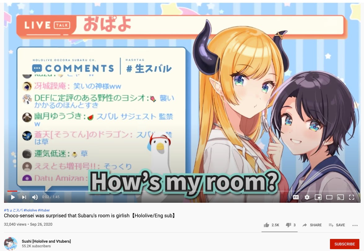 Much like BAS.media using the avatar of a young woman to build their digital entertainment firm, there’s a Vtuber management company, as well. One of the bigger ones is Hololive, which is owned by the Japanese company Cover Corp. It’s built like a traditional idol group, with auditions and voting for favorite members. But, of course, they’re all avatars.