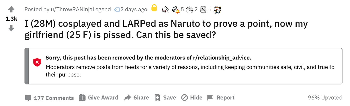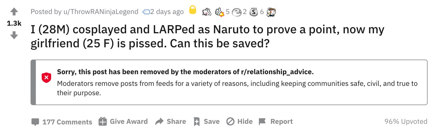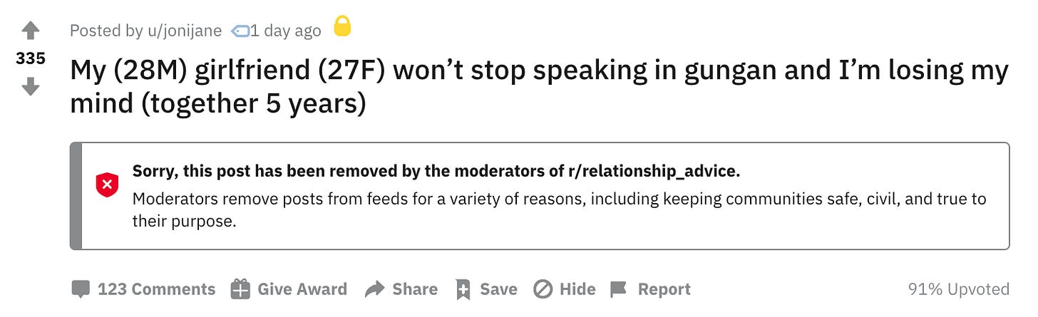 I approach the completely deranged content on advice subreddits the same way I approach pretty much everything I see on the internet — it’s probably fake, but it also definitely reflects some kind of reality and I also just appreciate it for its entertainment value.