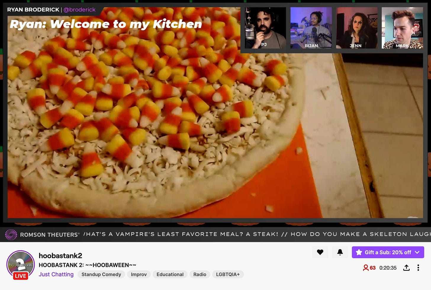 For the last few months, I’ve been streaming on Twitch with some really amazing people — Glitch’s Jenn Schiffer, The Verge reporter Bijan Stephen, and comedian Mark Vigeant. Our show is called Hoobastank2 and it’s kind of like if you combined a Japanese game show with a TED Talk. The screenshot above is from our Halloween special (Hoobaween obvz) where I cooked and ate a candy corn pizza. It was very oily and I didn’t like it.
