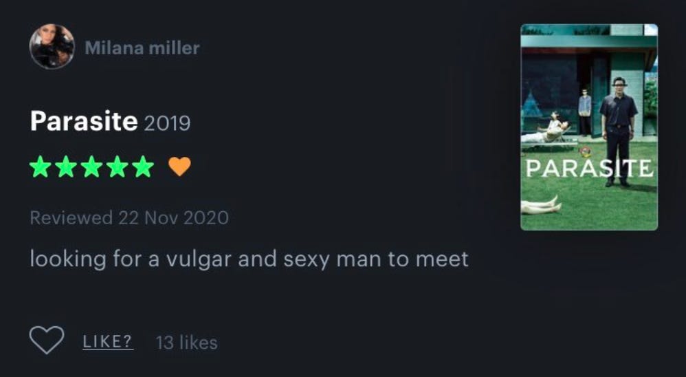 I spent a little bit trying to find “Milan Miller” on Letterboxd this morning, but sadly, I think her account has been pulled down. I came across this screenshot on the ribs505 Tumblr blog. “Milana” describes herself in her Letterboxd bio as, “I love the morning male boner! I will meet!” And she gave Parasite a 5-star review. We have to stan.