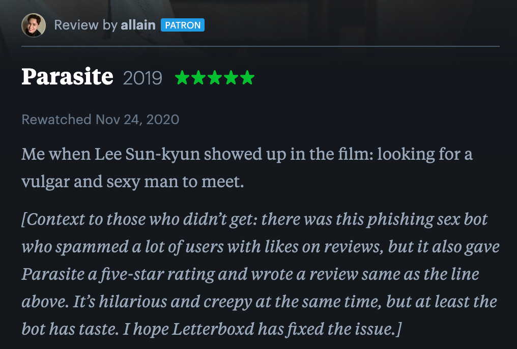 A Porn Bot Gave Parasite A 5-Star Review On Letterboxd