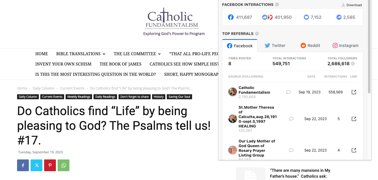 According to Newswhip, seven of the top 10 most interacted with “news” articles on Facebook in September — as in third-party links to “publishers” — all came from one domain: catholicfundamentalism.com. The top story from this exciting new digital publisher was titled, “Do Catholics find “Life” by being pleasing to God? The Psalms tell us! #17.” and it has around 400,000 total interactions and around 2,500 shares. Weirdly enough, just like the potato meme that people are praying to, the comments underneath the post are, also, just people writing “amen” over and over again. The only actual news stories in the top 10 last month, aside from the aforementioned Jimmy Buffet obit, was a story about Meta’s Messenger app getting the notes feature, which was written by Filipino news outlet ABS-CBN, and a story from Legit about Nigerian popstar Davido giving a TikTok user a new iPhone 14 Pro Max.
